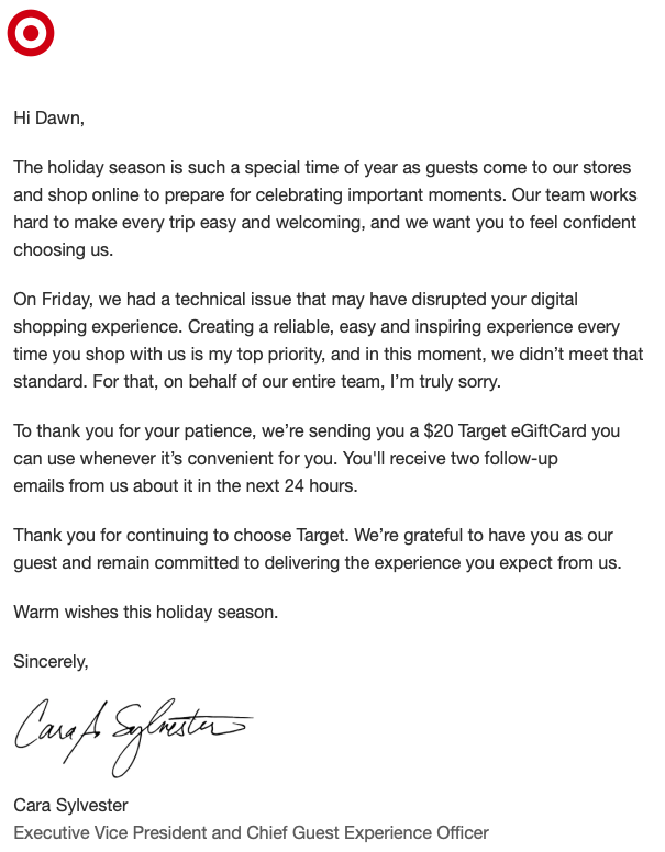 Easy for you to do Target. A $20 gift card. Simple. Small. Humble. Plus, follow up with a survey.